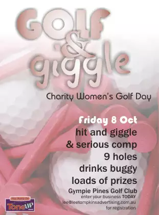 Registration is from 1pm, there will be a warm up clinic from 1.30 with Golf Pro Patrick Jones,  and the event, which is a 3 person Ambrose, kicks off at 2pm sharp with a shotgun start. All women are welcome – there will be as many giggles as golf and you do not have to know how to play – it is for fun.   on. If you wish to hire a buggy please contact the Gympie Golf Club direct on 54812795